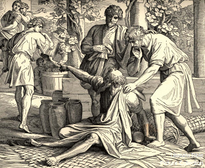 Genesis 9:21-27 Noah got drunk and was naked. Noah's son, Ham, saw Noah and told his brothers Shem and Japheth. They walked backwards and not looking at naked Noah, covered him. When Noah awoke, he cursed Canaan (Ham’s son) to be a slave.